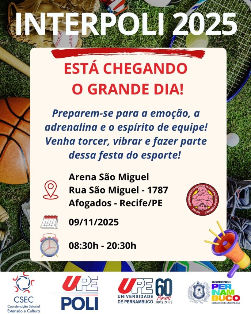 🥇🥈🥉 O INTERPOLI é o evento esportivo que reúne toda a comunidade 🌐 da Escola Politécnica da UPE. Equipes 🏆 formadas por alunos, servidores e professores 👤 competem em modalidades esportivas ⚽️🏐 na Arena Esportiva São Miguel em Recife/PE em 09/11/25.