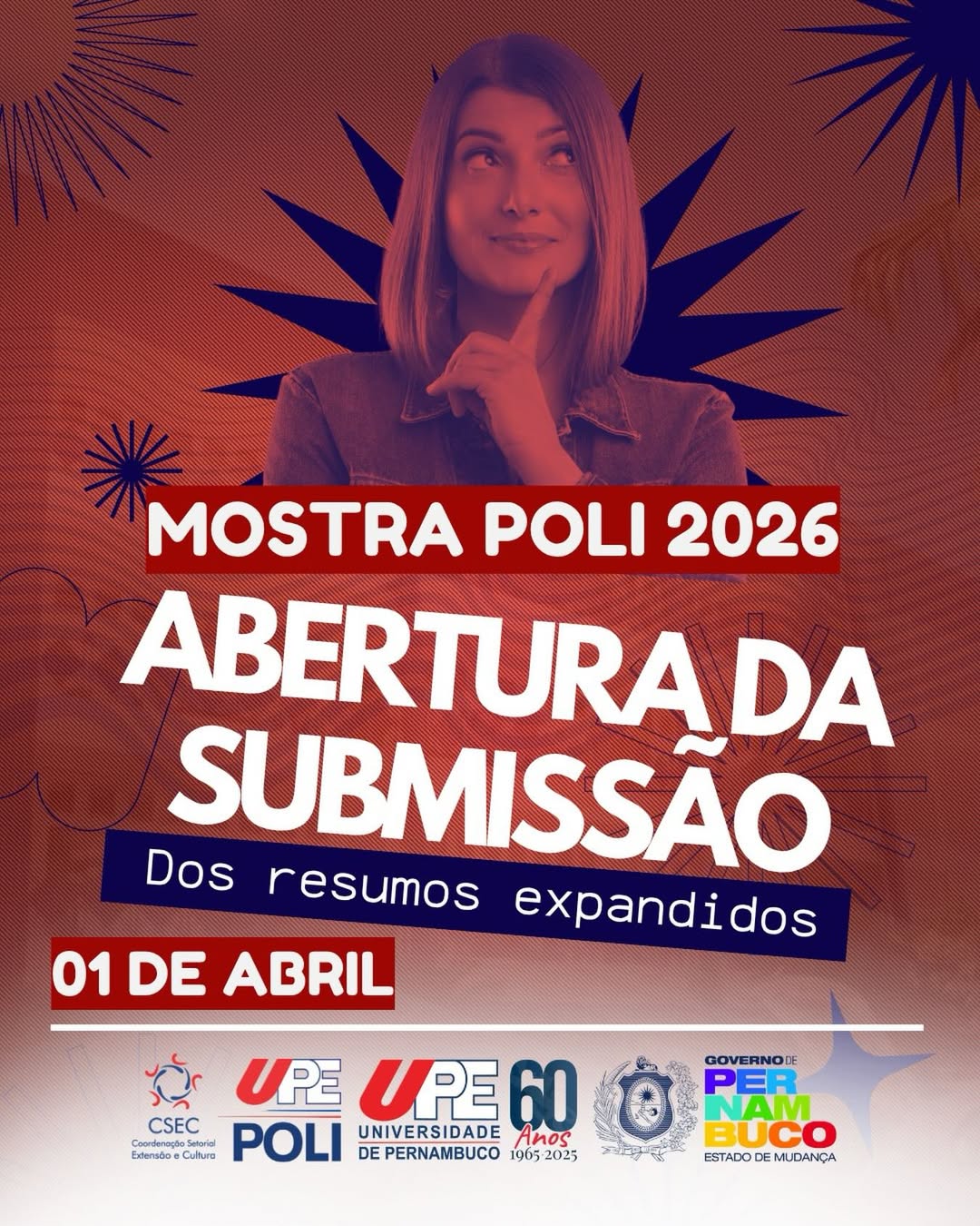 A Coordenação Setorial de Extensão e Cultura (CSEC) da Escola Politécnica da Universidade de Pernambuco (POLI/UPE) convida seu corpo docente e discente a participar da Mostra de Extensão, Inovação e Pesquisa da POLI 2026.